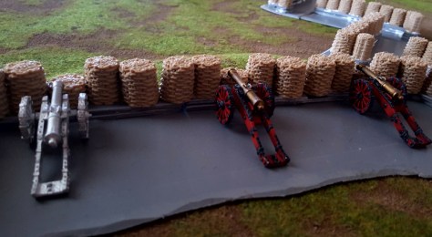 Die Geschützstellung der ersten Parallele beinhalt drei 8-Pfünder Kanonen der Figuren-Firma Front Rank. Die Geschützbedienung ist eine Mischung aus Front Rank und Sash and Saber Miniaturen. Die Gabions / Schanzkörbe sind alle aus dem 3D-Drucker, die Erdwerke und hölzernen Rückrollflächen habe ich selbst gebaut. Hinzu kommen ein paar alte Kisten und Fässer von Pardulon sowie weiteres Zubehör, dass ich selbst modelliert habe.
