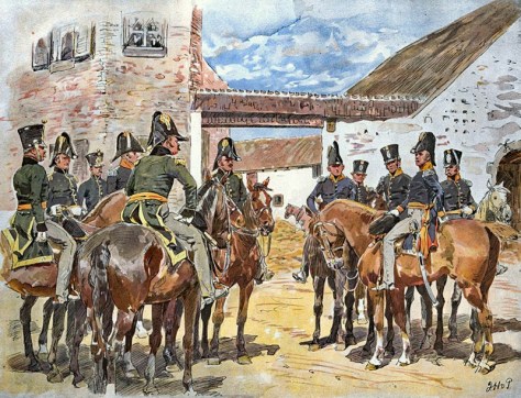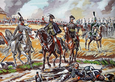 Prinz Karl Bernhard von Sachsen-Weimar mit dem Stab der 2. Brigade vor dem Pachthof von Quarte Bras: „Meine Herren ich habe noch nie gehört, dass man einen Feldzug mit einem Rückzug beginnt. Halten Sie die Kreuzung!“