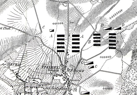 Um 14 Uhr rücken die Franzosen aus Richtung Frasnes vor. Für den Angriff stehen Marschall Ney zunächst die Divisionen Bachelu und Foy sowie die Kavallerie Pirè zur Verfügung. In Bataillons-Kolonne geht die Division Bachelu östlich der Hauptstraße gedeckt durch die zwei Einheiten der Chasseur à Cheval in Richtung Piraumont vor. Die Division Foy marschiert auf und westlich der Straße, gefolgt von den beiden Lancier-Regimentern.