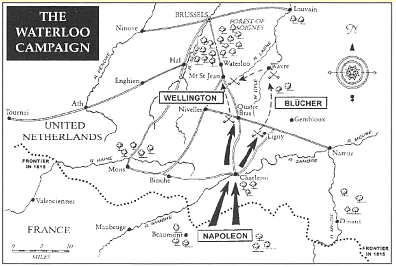 Napoleons Plan für den Feldzug von 1815 war es, mit seiner Armee zwischen den Kantonierungsgebieten der Anglo-Alliierten und der Preußischen Armee in Richtung Brüssel vorzustoßen, dabei die Verbündeten voneinander zu trennen und einzeln in zwei Schlachten zu besiegen.