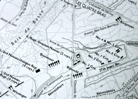 Prinz Bernhard von Sachsen-Weimar, Kommandeur der 2. Brigade der 2. Niederländisch-Nassauische Infanterie-Division, hatte sein Hauptquartier in Hautain le Val, wo auch das 1. Bataillon des 2. leichten Infanterie Regiments biwakierte. Die Freiwilligen Jäger lagerten bei Thines, das 2. Bataillon des 2. leichten Infanterie Regiments bei Frasnes. Das 3. Bataillon hatte sein Quartier in Sart-Dames-Avelines. Das 1. und 2. Batallion des Regiments Oranien-Nassau hatte man in und rund um Genappe untergebracht.