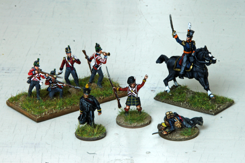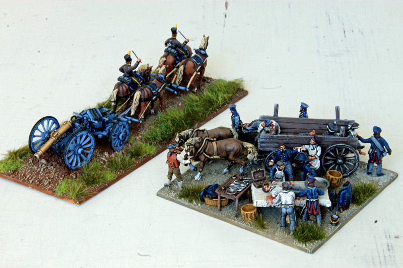 Hinzu kommen noch unterschiedliche Basen für Spielmarker. Für Marker, die den Moralzustand der Einheit darstellen, verwende ich Rundbasen mit Verwundeten (Disorderd)und Toten (Wavering). Für den Marker „Formation in Unordnung“ verwende ich einen Trommler oder Artilleristen (der z. B. Munition holt) auf Rundbase. Schließlich wird die sogenannte „Line of Communications“ einer Armee durch ein kleines Diorama dargestellt (9 x 9 cm).