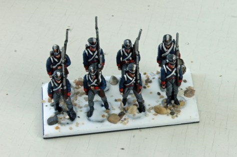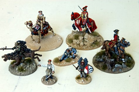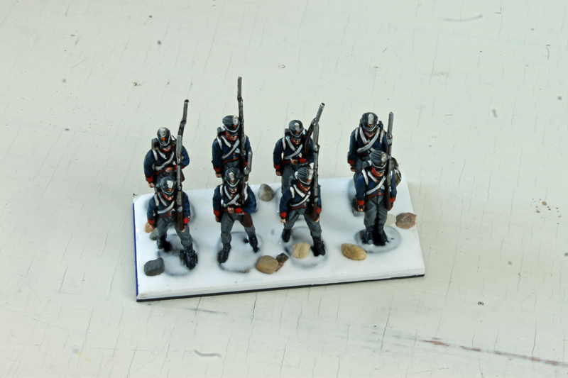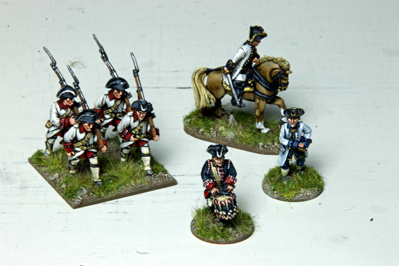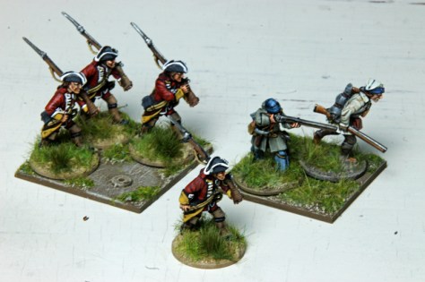 Mein Kompromiss zwischen Einzelfiguren und Multibasen ist ein Weg, der mehrere der genannten Ansätze vereinigt. Als Beispiel will ich meine Armee des French and Indian War heranziehen. Für diese Armee verwende ich 28 mm Figuren und ganz unterschiedliche Regelsysteme, die große Schlachten und kleine Gefechte abdecken. Meine Truppen bestehen deshalb teilweise aus einzeln basierten Figuren, die für große Schlachten auf Multibasen gestellt werden. Die andere Hälfte besteht aus Figurengruppen, die fest auf einer Multibase angebracht sind. Natürlich könnte man auch alle Figuren einzeln basieren, ich benötige jedoch für kleine Gefechte maximal ein Viertel meiner Truppen und die Multibasen sind deutlich einfacher in der Herstellung, sehen etwas besser aus und ihre Handhabung ist unkomplizierter.