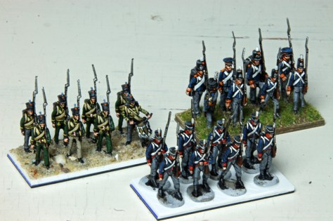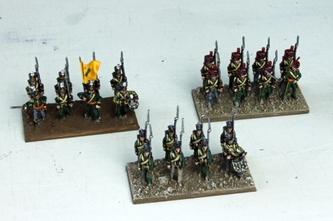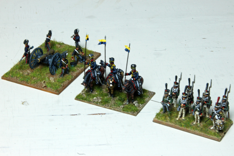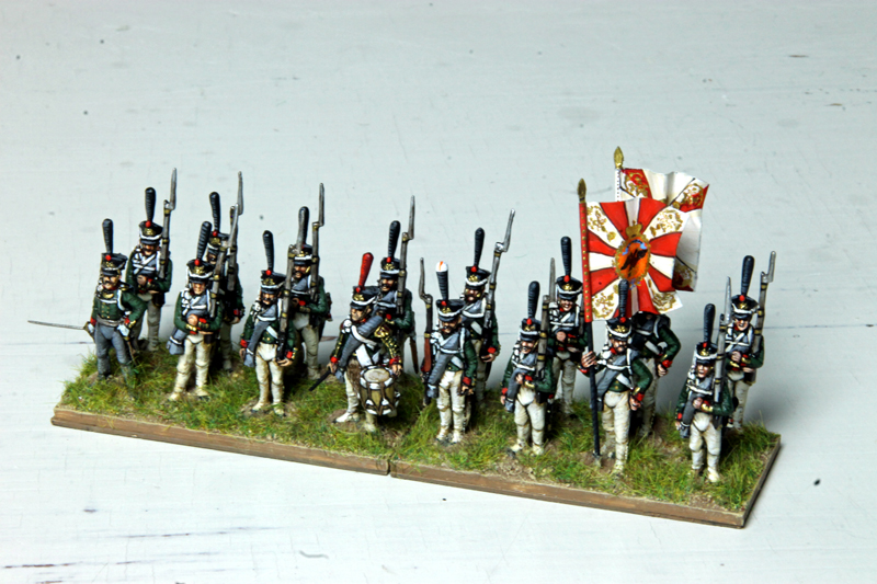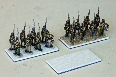Ich spiele das Regelsystem Field of Glory Napoleonic (FoGN) im Maßstab 1/72. Zum einen habe ich mich bei der Wahl der Basengrößen und Formen an die Vorgaben des Regelsystems gehalten, diese aber durch einige Variationen an meine Vorstellungen angepasst. Bei Field of Glory Napoleonic stellt eine Infanterie- oder eine Kavallerie-Einheit ein Regiment dar. Die Einheit kann dabei, abhängig von der Anzahl der Kombattanten, unterschiedlich groß sein (4 oder 6 Basen). Eine Infanterie-Base entspricht also rund 300 bis 500 Soldaten, eine Kavallerie-Base 125 bis 200 Reiter.