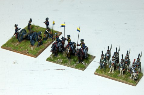 Ich habe für den sogenannten „Ground Scale“ ein Verhältnis von 1/1000 gewählt. 1 cm auf dem Spielfeld entsprechen also 10 Meter auf dem Originalschlachtfeld. Ein französisches Infanterie Bataillon in Linienformation (500 Mann) hatte zur Zeit der Napoleonischen Kriege eine Breite von rund 125 Metern. Die 2 Basen, die im Spiel eine Bataillon darstellen, hätten nebeneinander eine Breite von 12 cm (6 cm Frontbreite pro Base), was laut „Ground Scale“ 120 Metern auf dem Originalschlachtfeld entsprechen würde. Eine preußische Schwadron Husaren (146 Reiter) hatte in Linie eine Frontbreite von 60 Metern, was wiederum mit den 6 cm = 60 Metern der Basen korrespondiert. Eine abgeprozte britische Batterie von 6 Geschützen hatte zwischen den Geschützen jeweils ein Intervall von 10 Metern. Also funktioniert auch hier der Groundscale von 1/1000.