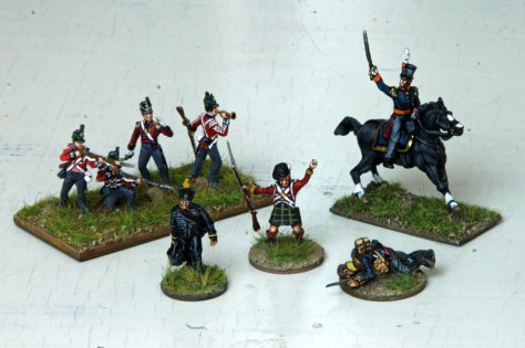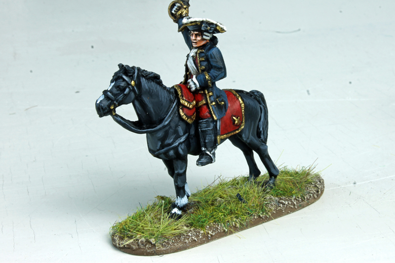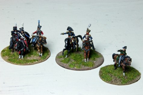 Für die Kommandeure verwende ich Rundbasen, damit diese schnell und eindeutig auf dem Spielfeld erkennbar sind. Außerdem benötigen diese Basentypen keine klar definierte Ausrichtung. Auch die Größe der Basen spielt eigentlich keine Rolle, sondern folgt nur praktischen Gesichtspunkten. Für den Oberbefehlshaber (Korpskommandeur) verwende ich eine Base von 6 cm Durchmesser mit 3 Figuren, für den Divisions-General eine 6 cm Base mit 2 Figuren und für den Brigade- bzw. Regimentskommandeur eine Rundbase mit 5 cm Durchmesser und einer Figur. Damit ich die Meldereiter / Adjutanten von den Brigade- bzw. Regimentskommandeuren unterscheiden kann (beide bestehen aus einer Reiterfigur), verwende ich für die Meldereiter rechteckige Basen (2 x 4 cm).
