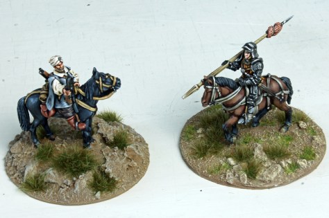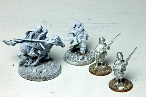 Nach dem „besanden“ (rechts) werden die Figuren „grundiert“ (links). Bei der Reiterfigur ganz links habe ich aus optischen Gründen auch die hohe, abgeschräkte Base „besandet“.