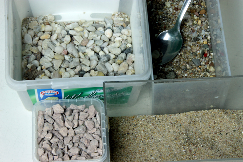 Mit einem leicht feuchtem Pinsel bringe ich an einigen Stellen, vor allem rund um die kleinen und großen Steinchen (hier sammeln sich in der Natur häufig die Samen von hohen Gräsern) Leimflecken auf. Ich verwende hierbei wieder den schon erwähnten Weißleim.