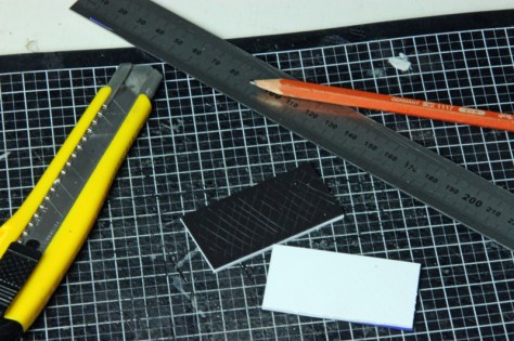 Zunächst müssen aus den großen Polystyrol-Platten und der Magnetfolie die Basen geschnitten werden. Ich zeichne mit dem Bleistift die gewünschten Maße auf die Platte / Folie. Die Polystyrol-Platten werden dann mit der Spitze des Cutter-Messers und mit leichtem Druck an der eingezeichneten Schnittkanten eingeritzt. Nun lässt sich die Platte an lang der eingeritzten Linie leicht brechen. Auf diese Weise erhält man schnell die Basen mit sehr exakten Maßen und Kanten. Die Magnetfolie wird mit leichtem Druck mehrfach an den eingezeichneten Schnittkante eingeritzt, bis das Material durchtrennt wurde. Nun ritze ich mit dem Cutter die Ober- und Unterseite der Polystyrol-Platten und der Magnetfolie rautenförmig ein. Dabei zieht man mit dem Cutter erst Linien diagonal nebeneinander in die Oberfläche und kreuzt diese dann diagonal mit Linien in die andere Richtung. Durch diese aufgeraute Oberfläche wird die Klebe-Verbindung zwischen Polystyrol-Platte und Magnetfolie sowie zwischen Polystyrol-Platte und Figurenbase wesentlich gestärkt. Die Unterseite der Magnetfolie (also die magnetische Fläche) muss zwar nicht verklebt werden, hier hat die raue Struktur aber eine andere Funktion. Stellt man Figurenbasen an Hänge von Spielfeldhügel, rutschen diese häufig durch die glatte Unterseite der Basen hinunter. Die raue Unterseite verhindert das. Einige Tabletop-Spieler verwenden statt des Rautenmusters auch grobes Schleifpapier, welches auf die Unterseite der Base geklebt wird.