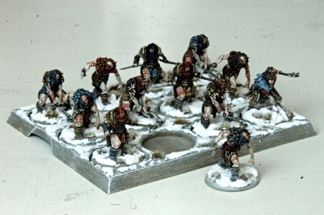 Nun werden die Figuren auf die Base geklebt. Allerdings verwendet man bei Multibasen nur fertig bemalte Miniaturen, da ein nachträgliches Bemalen der Figuren kaum noch möglich ist.