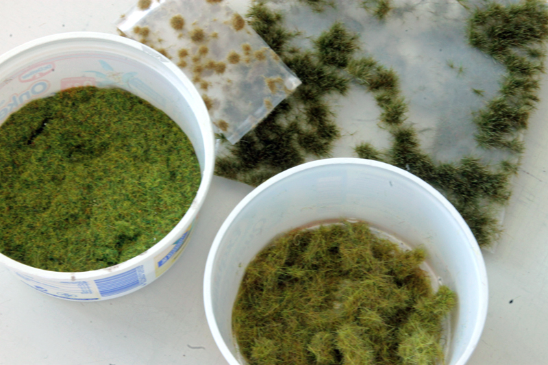 Außer bei Basen, die eine offene Sand- oder Steinwüste (und Ähnliches ohne Vegetation) darstellen sollen, wird nun Grasstreu aufgebracht. Grasstreu gibt es in unterschiedlichen Farben und unterschiedlichen Längen. Wer etwas mehr Geld oder Aufwand investieren möchte, kann auch gekaufte oder selbst hergestellte Grasbüschel verwenden. Das lohnt sich vor allem, wenn man eine Landschaft mit sehr spärlichen Bewuchs darstellen will. Aufwendiger, aber bei Darstellung von unkultivierter Vegetation realistischer, ist die Verwendung von unterschiedlichen Grasstreu-Längen. Dabei sollte das unterschiedliche Streu aber nicht gemischt, sondern getrennt voneinander und in zwei Arbeitsschritten aufgebracht werden.