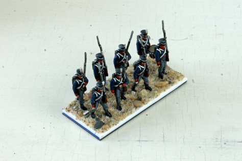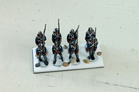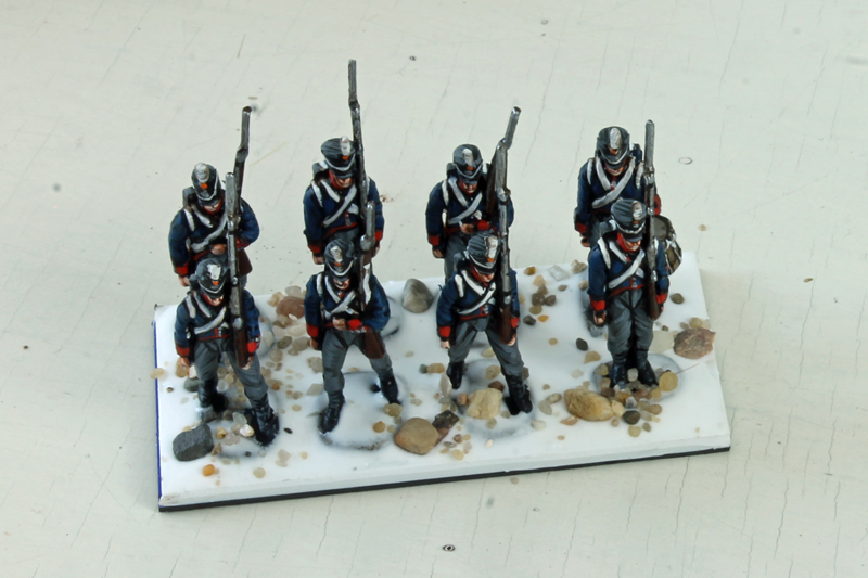 ⦁ Infanterie: 6 (breit) x 3 (tief) cm / 8 Figuren in zwei Gliedern