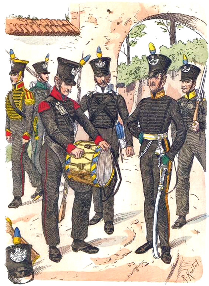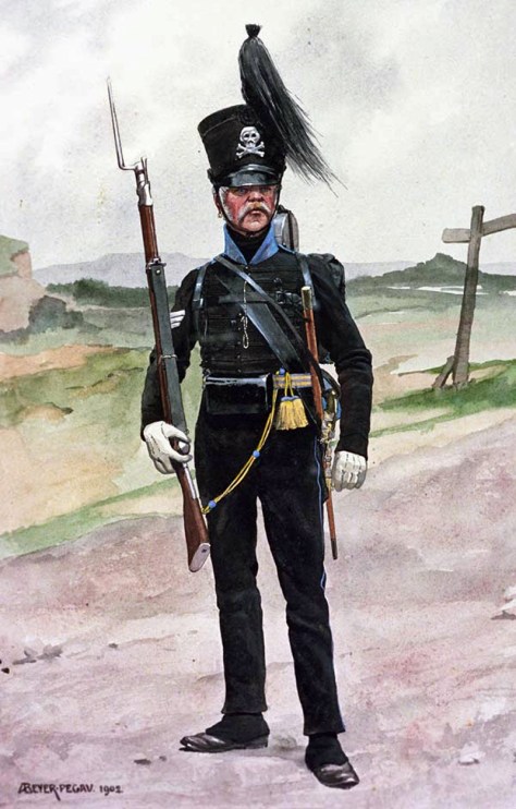 Die Uniform der Mannschaften bestand aus dem üblichen Dolman und schwarzer Tuchhose. Die Ärmelaufschläge in schwarz mit schwarzem Vorstoß. Der schwarze Filz-Tschako hatte ebenfalls den Rossschweif und einen silbernen Totenkopf. Die Hosen hatten eine hellblaue Biese. Dazu wurden schwarze Stiefel sowie untergeknöpfte Gamaschen verwendet. Das Bandelier mit Patronentasche sowie Koppel mit Bajonettscheide ebenfalls aus schwarzem Leder. Auf der Rückseite des schwarzen Segeltuch-Tornisters war ein weißes Pferd aufgemalt, oben aufgeschnallt ein weißmetallenes Kochgeschirr, unter dem Deckel graue, einreihig geknöpfte Mantel. Der Brotbeutel bestand aus schwarzem Leinen. Die Feldmütze war schwarz mit hellblauen Kopfband und Paspel. Bewaffnet waren die Soldaten mit englischen Gewehren (Infanteriegewehr M1802, New Pattern und leichtes Infanteriegewehr M1802, New Land Pattern) sowie mit Bajonetten, hellblauen Feldflaschen und schwarzen Patronentaschen, die ebenfalls aus englischer Lieferung stammten.