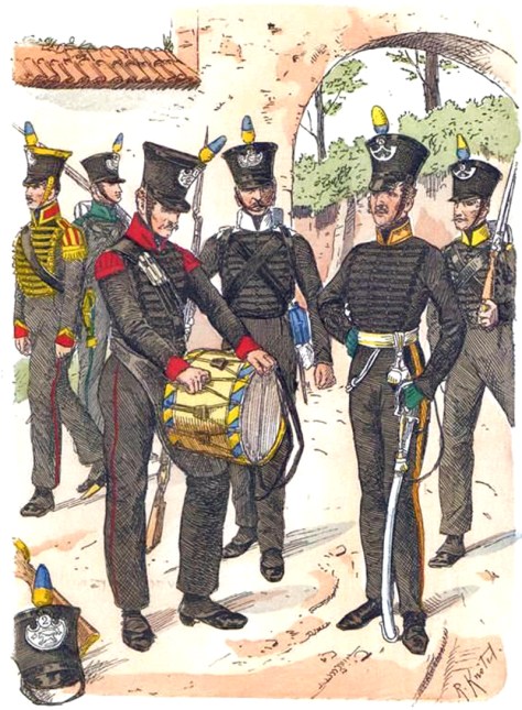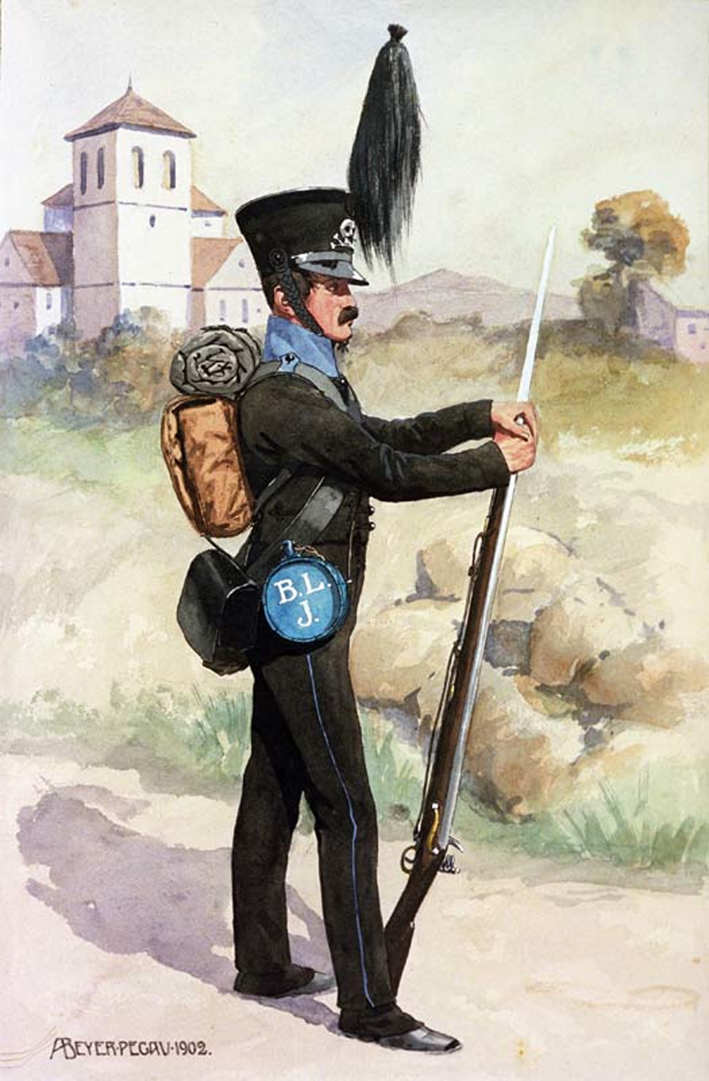 Die Mannschaften trugen, wie die Offiziere, einen Tirolerhut. Diesen allerdings mit grünem Band und Borte. Dazu den schwarzen Dolman mit schwarzen Schnüren und 3 Reihen Glasknöpfe, grünen Aufschlägen, Kragen und Schulterklappen. Ebenfalls die schwarze Tuchhose, hier aber mit dünner grüner Biese sowie schwarzem Schuhwerk mit Gamaschen. Die Patronentaschen und das Seitengewehr-Bandelier waren aus schwarzem Leder. Der Tornister war mit schwarzem Segeltuch bespannt, darauf oben das weißmetallene Kochgeschirr geschnallt. Bewaffnet waren die Männer mit französischen Beute-Gewehren, die zum Teil, um diese leichter zu machen, um 4 Zoll gekürzt und auf englisches Kaliber aufgebohrt waren. Zusätzlich wurden die Läufe geschwärzt. Am Bandelier stecke nur das Bajonett in schwarzer Lederscheide ohne Seitengewehr.