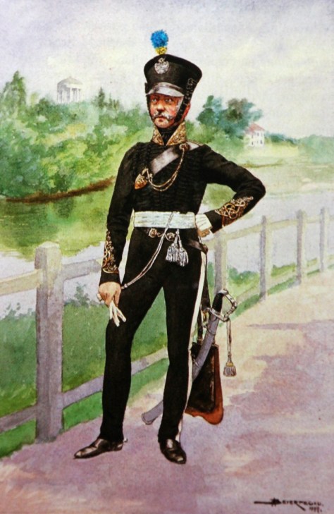 Die Offiziere trugen einen schwarzen Dolman mit fünf Reihen schwarzer Knöpfe und dichten Reihen schwarzer Schnüre, der Kragen in Abzeichenfarbe. Dazu schwarze Stickerei auf den Ärmeln, Kragen und Rückennähten. Darunter eine Weste in Abzeichenfarbe, mit silbernen Schnüren und Knöpfen. Der schwarze Tschako in Kiwer-Form hatte einen schwarzen Lederbesatz und Kinnriemen, vorn ein weißmetallenes Blech mit Pferd, Bataillons-Nummer und mit dem Motto „Nunquam retrorsum“ (Niemals zurück). Auf dem Tschako ein gelb-blauer Federbusch. Dazu schwarze Hosen mit Seitenstreifen in Abzeichenfarbe, schwarzen Stiefeln und weißen Handschuhen. Die Schärpe um die Hüfte war silbern, mit gelber Seide durchflochten sowie Schnüren und Quasten. Die Weste unter dem Kolett hatte einen Stoff in Abzeichenfarbe mit silberner Verschnürung und silbernen Knöpfen. Der Säbel in Eisenscheide mit silbernem Portepee hing am schwarzen Schwungkoppel. Die berittenen Offiziere verwendeten schwarze Kartuschen am Bandelier und schwarze Säbeltaschen.