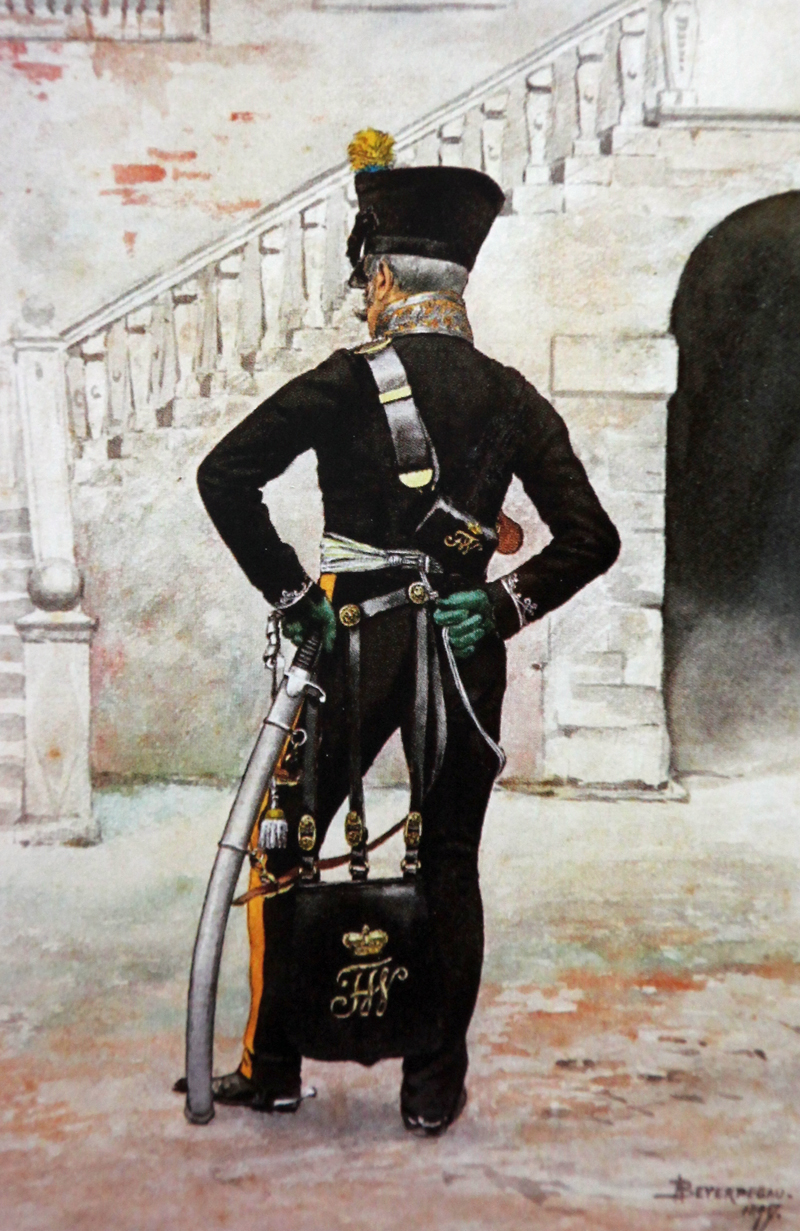 Die Trompeter trugen die Uniform der Mannschaften, dazu schwarz-gelbe Schwalbennester, eine Messingtrompete mit blau-gelber Schnur und schweren gelben Troddeln.