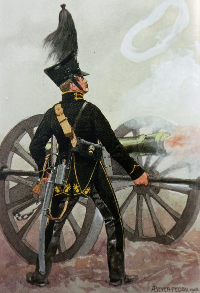 Die Mannschaften und die Unteroffiziere trugen schwarze Kollets mit 10 Reihen schwarzer Schnüre sowie Quasten und Glasknöpfe. Die Männer der reitenden Batterie hatten schwarze Reithosen mit Lederbesatz und gelber Biese. Als Kopfbedeckung diente ein schwarzer Kiwer-Tschako mit Rossschweif und einer Messing-Granate sowie Sturmbänder aus Messing. Das aus Kartusche und Säbelkoppel bestehende Lederzeug war gelb, die Säbeltasche jedoch schwarz.