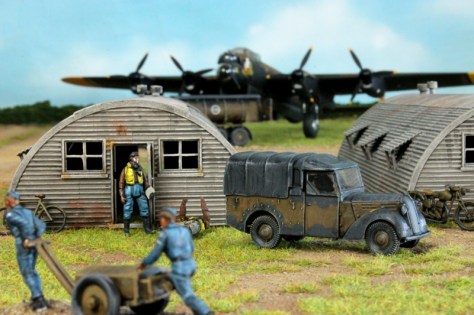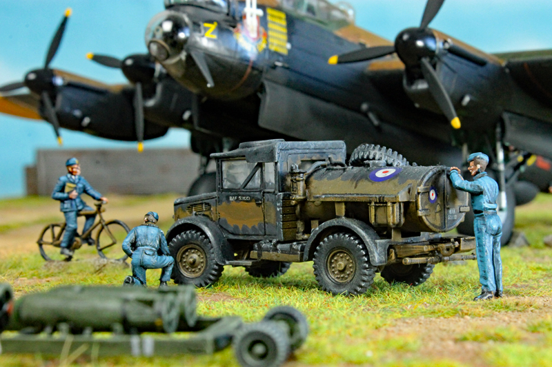 Aus diesem Modellbauset habe ich zunächst nur den AEC Matador Tankwagen verwendet, da der Bedford QLC Tankwagen meist nur bei der Betankung von kleinen Jagdflugzeugen eingesetzt wurde. Der AEC Matador war ein schwerer 4 × 4- LKW, der im Wesentlichen als Artillerie-Zugfahrzeug von der Associated Equipment Company während des Zweiten Weltkriegs für britische und Commonwealth-Streitkräfte gebaut wurde. Die RAF verwendete vor allem den 6-Rad-Matador Typ A in Flachbettform mit Tankpumpen und Ausrüstung von Zwicky Ltd. als Tankwagen, der 2.500 Gallonen Kraftstoff transportieren konnte. Bei diesem Modell handelt es sich um einen älteren Bausatz von Airfix, also noch im früher üblichen Maßstab 1/76 und ohne durchsichtige Scheiben geliefert. Sehr schön, man kann die hinteren Fahrzeugtüren auch geöffnet darstellen und so die Pumpvorrichtung sichtbar machen.