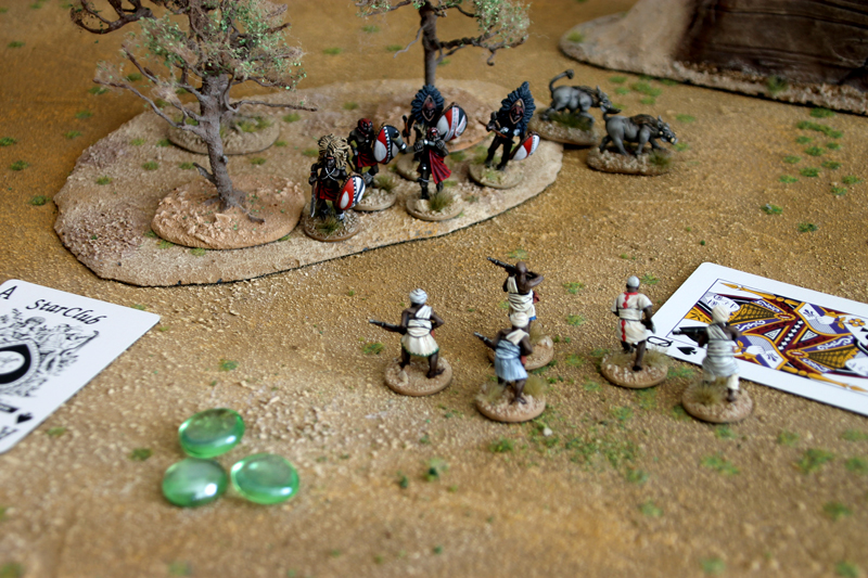 Ich möchte das Regelwerk jedoch für ein ganz anderes Setting nutzen. In meinen geplanten Spielen soll es in das koloniale Afrika des 19. Jahrhunderts gehen. Für diese Wahl sind zum einen meine zum Teil bemalten, aber bisher noch unbespielten 28 mm Massai und zum anderen eine große Tüte unbemalter afrikanischer Tiere verantwortlich. Es geht also nicht nur um das Regelwerk, sondern auch darum, den Zinnberg zu verkleinern.