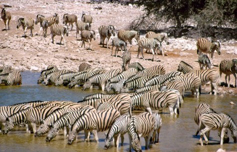 Eindrucksvoll sind vor allem die großen Herden von Steppenzebras, die am Abend zum Trinken an die Wasserlöcher kommen.