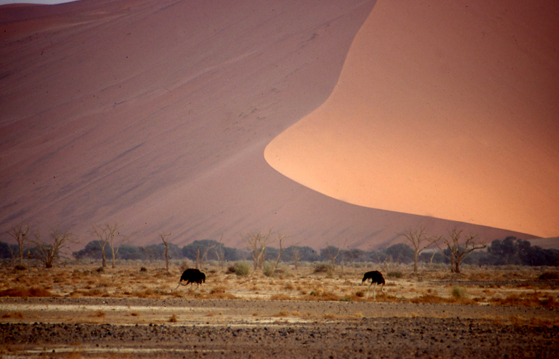 Sicher einer der am meisten besuchten Orte in Namibia, das Deadvlei. Hier endet das Trockental Sossusvlei, welches es den Reisenden erlaubt, tief in die Namib-Wüste vorzubringen. Wer hierher kommt, will allerdings keine Tiere beobachten, sondern die riesigen Dünen der Namib bestaunen. Doch trotz der nahezu wasserlosen Sandwüste trifft man auch hier auf erstaunlich viele Tiere, wie Strauße und Spießbock, besser als Oryx bekannt.