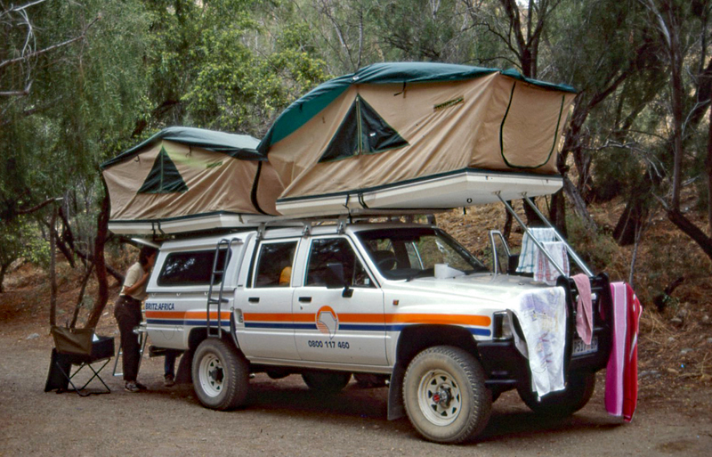 Für mich eines der genialsten Arten zu Reisen. Dieser Geländewagen hat nicht nur eine komplette, Küche, Tische und Stühle, Vorräte, Sonnensegel und Wassertank an Bord, auch ein Kühlschrank mit separater Autobatterie fehlt nicht. Zum Schlafen werden einfach die Zelte auf dem Dach umgeklappt, fertigt. Das Dachzelt ist außerdem ein guter Schutz gegen wilde Tiere.