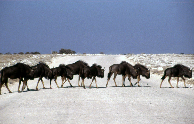 Streifengnus (oder Weißbartgnus?) überqueren die Straße und erreichen schließlich ein Wasserloch.