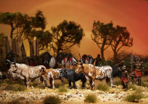 Die Figuren stammen natürlich aus der Schmiede von Wargames Foundry. Meines Wissens gibt es auch keinen anderen Hersteller von 28 mm Massai-Figuren und das ist auch gar nicht notwendig, da die Serie eine große Auswahl und eine hervorragende Qualität bietet. Es gibt die Massai-Krieger von Foundry ohne Kopfschmuck, mit dem berühmten Straußenfeder-Kopfschmuck und mit einem Kopfschmuck aus Löwenmähne. Durch diese drei Varianten lassen sich gut unterschiedliche Kriegerklassen darstellen. Speere, Schwerter und Keueln kann man seperat dazu kaufen oder man bastelt sich aus Besenborsten selbst welche. Neben dem Krieger gibt es auch ein Set mit Dorfbewohnern. Miniaturen von Rindern und Ziegen gibt es ebenfalls von Foundry, North Star oder Empress Miniatures.