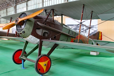 Bei der Hanriot HD.1, einem französischen Jagdflugzeug, dass 1916 in Dienst gestellt wurde, handelte es sich um einen einstieligen Doppeldecker. Rumpf und Tragflächen waren stoffbespannte Holzkonstruktionen mit Duraluminiumblechen im Vorderrumpfbereich, wobei die Leitwerke mit einem Stahlrohrrahmen verstärkt waren. Obere und untere Tragflächen waren unterschiedlich lang und gestaffelt ausgeführt, wodurch der Pilot eine hervorragende Sicht bekam. Die Hanriot HD.1 war ein leicht zu fliegender und sehr wendiger kleiner Jäger, der trotz einfacher Bewaffnung und des etwas leistungsschwachen Motors zu einem der meistgefertigten Jagdflugzeuge des Ersten Weltkrieges wurde. Das hier im Museum gezeigte Modell einer Hanriot-Dupont HD-1 war noch bis 1922 in Dienst und gilt heute als einziges Originalexemplar.