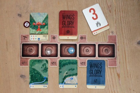 Bewegt bzw. geflogen werden die Maschinen durch Manöverkarten, die man immer für drei Runden im Voraus festlegen muss. So entsteht eine Art „Fog of War“ sowie eine gewisse Spannung. Welche Flugbahn oder welches Manöver wird der Gegner wohl geplant haben? Das TableTop-Element von Wings od Glory findet sich in der „freien“ Bewegung, also ohne Felder, auf dem Spielfeld, wobei die Manöverkarten als Schablonen eingesetzt werden. Grundsätzlich finden alle Aktionen „gleichzeitig“ für alle Spieler statt. Dadurch wird das Spiel sehr dynamisch und kein Spieler muss endlos warten, bis er wieder an der Reihe ist.