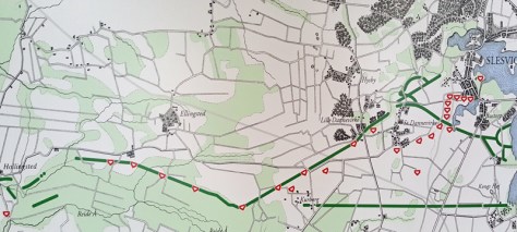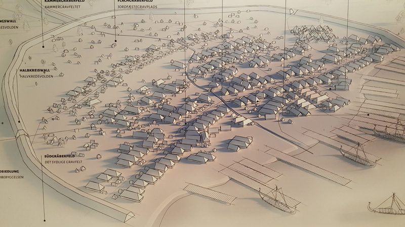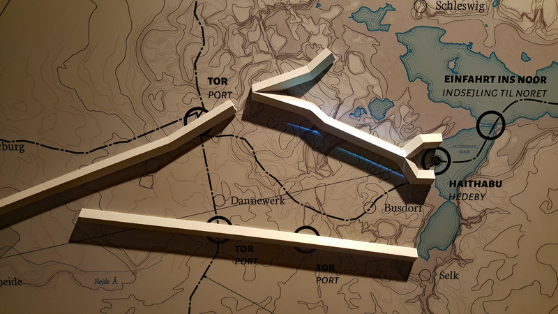 Die Drei Bilder zeigen die Wallanlagen in der Zeit der Wikinger und die Verbindung mit dem Handelplatz Haithabu.