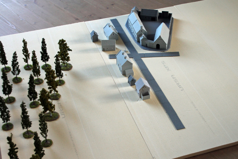 Netterweise hat mir Jens schon ein paar Dateien vorab zur Verfügung gestellt. Ich konnte also schon mit der Planung und Bemalung der Gebäude an der Straßenkreuzung beginnen. Zunächst habe ich die Gebäude ausgedruckt und eine Stellprobe vorgenommen. Ich plane eine Spielplatte mit den Maßen 180 x 240 cm, wobei die kurzen Seiten die jeweilige Grundkante darstellen. An der oberen kurzen Kante wird fast mittig (etwas nach links versetzt) die Straßenkreuzung liegen.