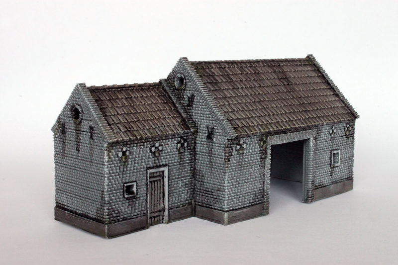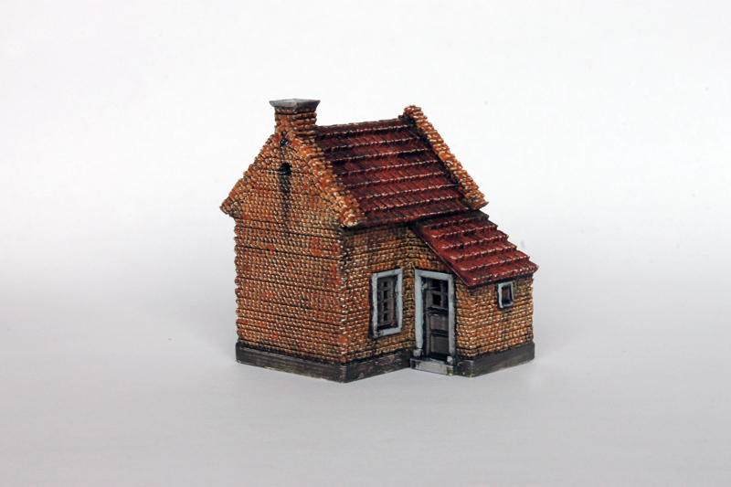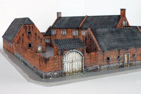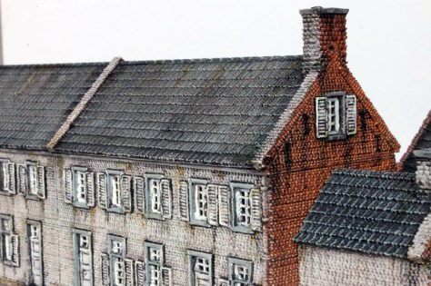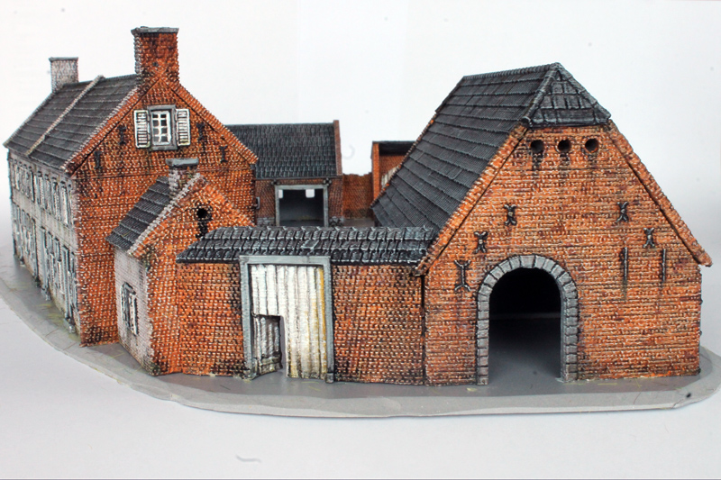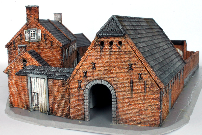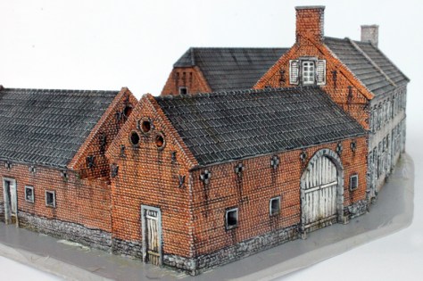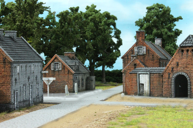 Bei der Farbgebung habe ich mich zum größten Teil an den Bildern von Stoney orientiert (s. mein Bericht dazu: https://tabletopdeutschland.com/2020/03/30/waterloo-quatre-bras-1815-teil-4/ ). Die Bilder zeigen, dass die Gebäude nur zur Hauptstraße hin weiß getüncht wurden und die anderen Gebäudeseiten die natürliche Farbe der Ziegelwände aufwiesen. Die Dächer waren überwiegend mit Schiefer gedeckt, nur kleine Nebengebäude mit gebrannten Dachziegeln.