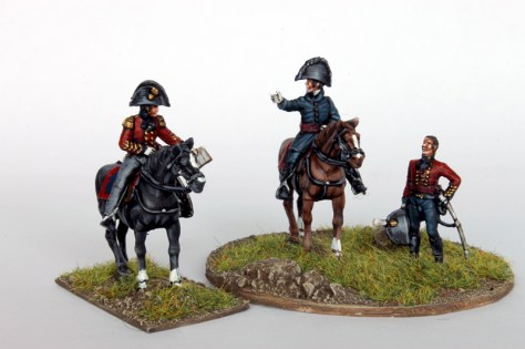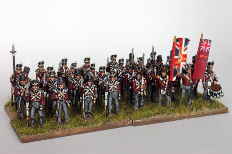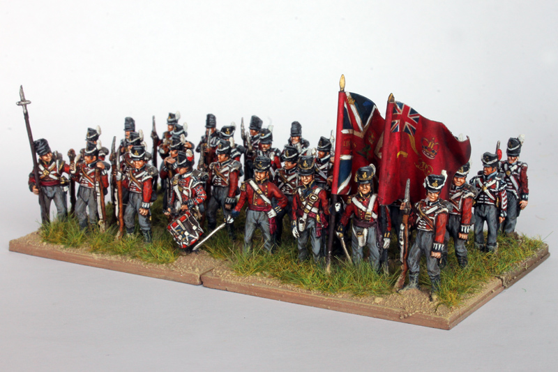 Die Bataillone der britischen Garde hatten die doppelte Mannstärke der Linienbataillone und werden von mir deshalb mit je vier Basen (32 Figuren) dargestellt. Die Figuren stammen von Art Miniaturen (Zinn) sowie A Call to Arms (Plastik), aber vor allem von Strelets (Plastik). Seit es einige neue Modelleure bei Strelets gibt, ist die Qualität dieser Plastikfiguren deutlich gestiegen. Ich habe das Set Set 201 „British Infantry Standing Order Arms“ verwendet und bin sehr begeistert. Die Kommandeure und der Meldereiter stammen aus der Italeri-Box Set 6065 „British and Prussian Allied General Staff“.