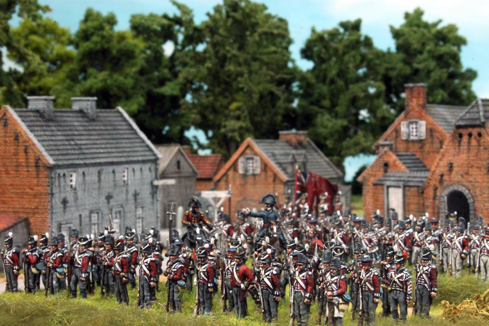 6. Großartige Bemalung. Deine Truppen und die Häuser sehen toll aus. – Schade, dass das Hauptgebäude von Quatre Bras so ungenau ist (Tor nicht genügend nach links versetzt, Dach zu spitz), da geht irgendwie das charakteristische verloren.