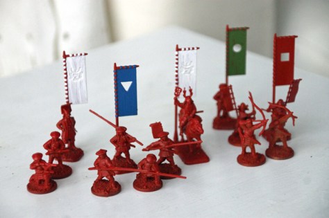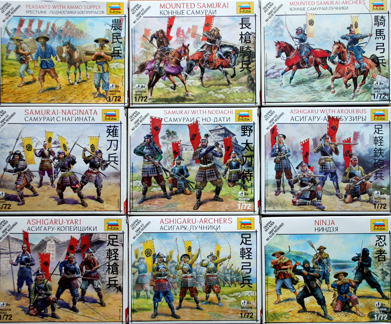 Mein Plan ist nun, das Ganze mit meiner alten Zvezda-Box, anderen Figuren, den neuen Regeln und Szenarien sowie einigen selbstgebautem Spielmaterial umzusetzen. Zum Glück habe ich im Keller noch einen Stapel alter Red Box – Weichplastik-Figuren und Weichplastik-Zvezda-Figuren zum Thema Samurai liegen. Mit diesen Sets lassen sich alle Truppen-Typen abbilden.