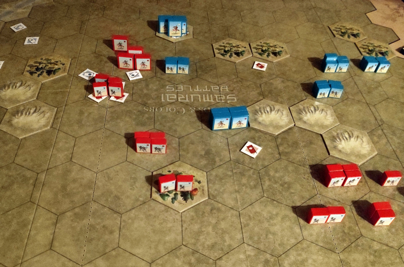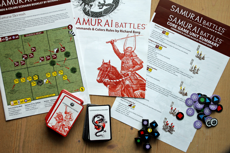Schließlich entschieden aber die Commands & Colors – Macher, GMT und Richard Borg, eine neue und verbesserte Version von Samurai Battles auf den Markt zu bringen. Mir persönlich wären Weichplastik-Figuren am liebsten gewesen, aber GMT hat sich für die bewährten Holzblöcke mit Aufklebern entschieden.