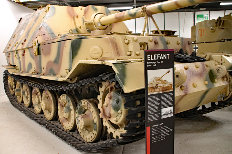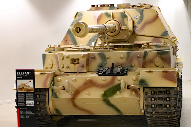 Nach der Schlacht von Kursk verblieben nur 50 Exemplare des Panzerjägers Ferdinand, von denen 48 zum Modell „Elefant“ umgerüstet wurden. Der Elefant in der Ausstellung erhielt die taktische Nr. 102 und wurde schließlich im Mai 1944 in Italien von den US-Streitkräften erbeutet. Die Fahrgestellnummer lautet 150040.