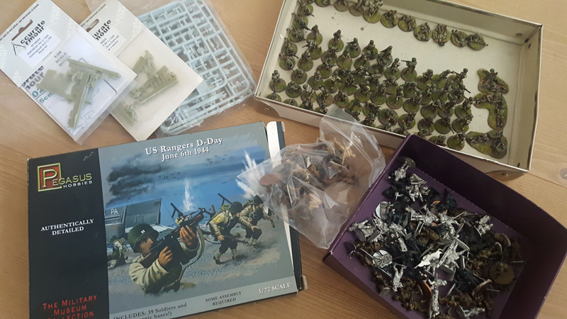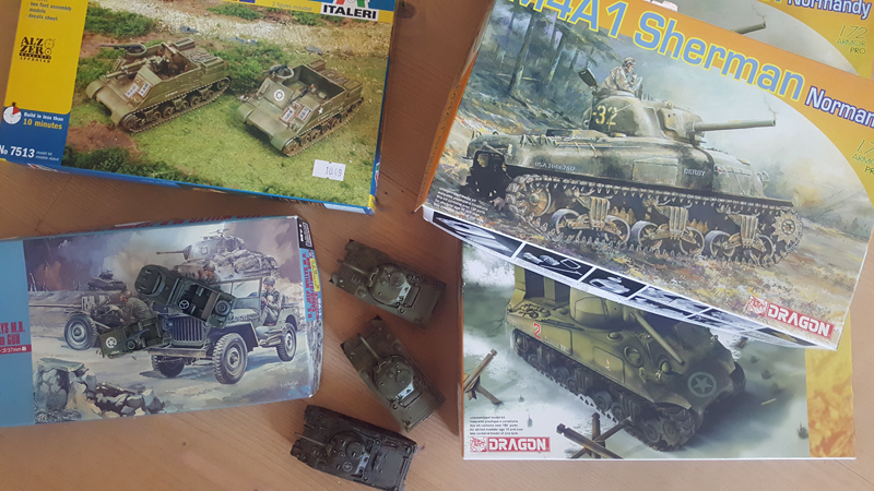 Hier muss ich nehmen, was ich bekommen kann. Was mich wirklich wundert, es gibt es in 1/72 keinen DD Sherman! Da muss ich wohl selbst ran und ein bisschen umbauen. Zum Glück hatte ich noch ein paar Normandie Sherman und auch einen mit Deep Wading Kit von Dragon im Keller schlummern. Auch Jeeps, Halbketten und M7 sind vorhanden. Es fehlt noch ein paar DUKW’s, Tank-Dozer sowie Kleinkram.