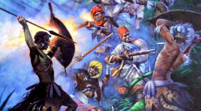 Wie schon “The Men who would be Kings” handelt es sich bei “Death In The Dark Continent” um ein Gruppen-Skirmish – System und auch die Anzahl der Einheiten und Figuren hat eine ähnliche Stärke. Man spielt eine Truppe mit rund 300 Punkten, was z.B. 2 bis 3 Einheiten britischer Infanterie mit je 4 Basen entspricht. Es wird also nicht mit einzelnen Figuren, sondern eckigen Multibasen gespielt. Die Anzahl der Figuren pro Base und die Basengrößen sind zwar im Regelwerk vorgegeben, sind aber meiner Ansicht nach nicht entscheidend. Man kann also auch eigene Basengrößen verwenden. Dabei gilt wie immer, dass die Größen für beide Seiten identisch sein sollten. Geführt wird die gesamte Streitmacht von einem Kommandeur oder Anführer, der unterschiedlich Qualtäten haben kann.