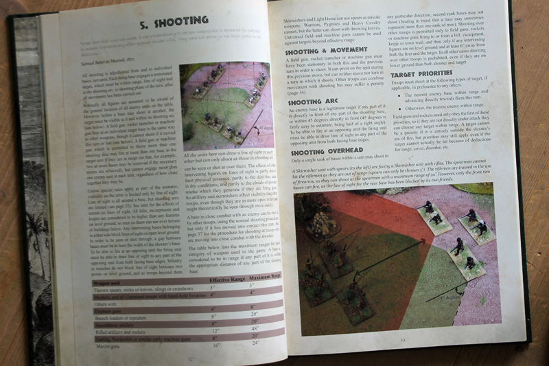 Die Regeln sind keine große Innovation und ähneln, zumindest auf den ersten Blick, vielen anderen Systemen. Eine Runde beinhaltet bekannte Elemente, wie bewegen, schießen, Nahkampf und Moral. Allerdings ist das Ganze kein I-go-You-go, sondern jede Phase wird von beiden Spielern durchgeführt, wobei nur die Reihenfolge bei der Bewegung festgelegt ist. Die Bewegungsreichweite wird immer durch einen Würfelwurf ermittelt, der je nach Einheitentyp mit einer unterschiedlichen Anzahl Würfel und einem Modifikator durchgeführt wird. Ungewöhnlich ist der D20, der für die Fernkampfphase eingesetzt wird, während man beim Nahkampf einem herkömmlicher D6 in die Hand nimmt. Aber die Handhabung bei Fernkampf und Nahkampf unterscheidet sich nicht nur durch die Art des Würfels. Während der Fernkampf noch relativ klassisch mit einem Würfel pro Base + Modifikatoren gehandhabt wird, gibt es in der Abwicklung des Nahkampfs nur einen Würfelwurf + Modifikatoren für den Angreifer …mehr nicht. Etwas sperrig finde ich die vielen gelisteten Modifikationen, die aber je nach Nation mehr oder weniger vernachlässigt werden können. Die Regeln lesen sich tatsächlich etwas umständlich und sind deutlich komplexer als “The Men who would be Kings”.