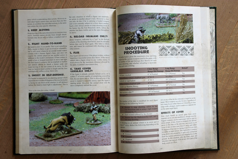 Aber damit nicht genug, neben den Standartregeln gibt es auch noch einen Teil mit Regeln für eine Großwildjagd. Hinzu kommen für eine Regelwerk recht umfangreiche Infos zu historischen Ereignissen, Personen und Schlachten. Man bekommt also einiges für sein Geld.