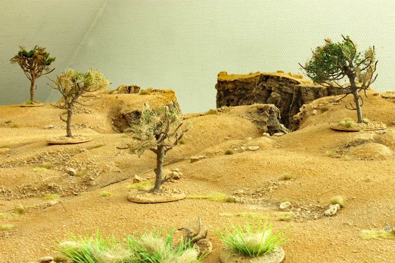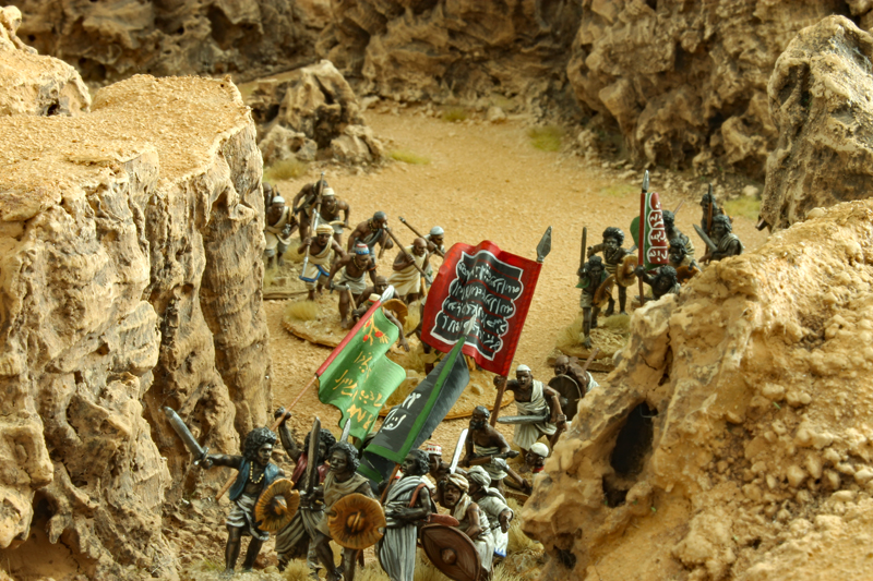 Für eine Testspiel habe ich 2 kleine Armeen von je 300 Punkten ausgewählt. Wieder ging es in den Sudan und wieder standen sich Briten und Beja gegenüber. Meine Briten bestanden aus zwei Einheiten Infanterie mit je 4 Basen, einer Gatling Gun und meinem Kommandeur. Die Streitmacht der gegnerischen Beja setzte sich aus 6 Einheiten Kriegern, einer Einheit Schützen und einer Einheit Schützen-Plänkler zusammen. Der Anführer der Beja war Teil einer Kriegereinheit. Alle Beja-Einheiten bestanden zudem aus je 4 Basen. Aus der Liste der vorgegebenen Szenarien habe ich „Surprise Encounter“ gewählt. Bei diesem und den meisten anderen Szenarien wird auch ein „Baggage Train“ verwendet, der bei Verlust Auswirkung auf die Moral der Truppe haben kann. Bei diesem Szenario treffen die Gegner in Marschkolonne aufeinander. Da den Beja „Surprise“ als Zusatz-Regel laut Armeeliste zusteht, haben sich die beiden Schützen-Einheiten versteckt aufgestellt, was durch 5 mögliche Punkte (Bäume als Marker) definiert wurde. Durch Zufall wird dann bei Annäherung ermittelt, wo sich die Beja tatsächlich aufhalten bzw. können die Beja auch die Einheiten selbst aktivieren.