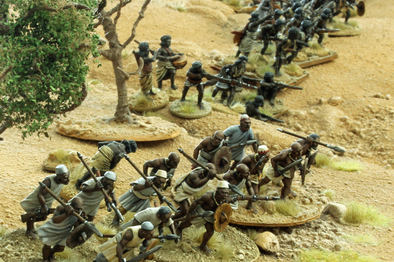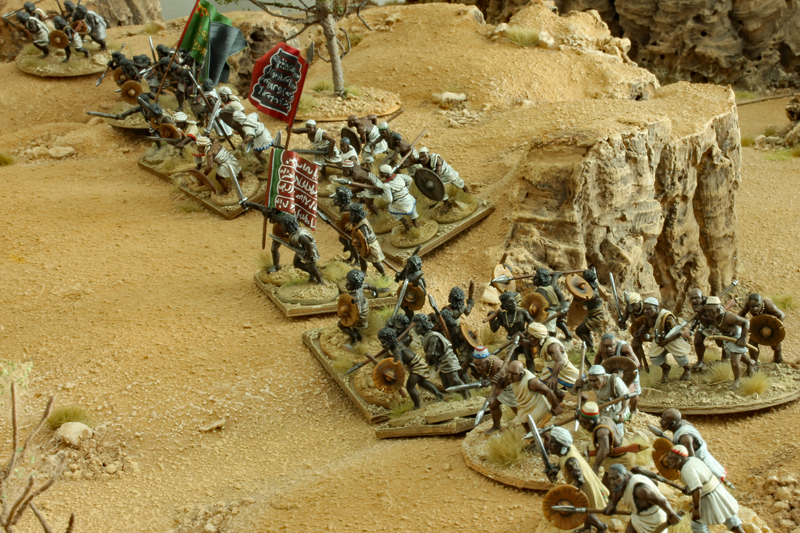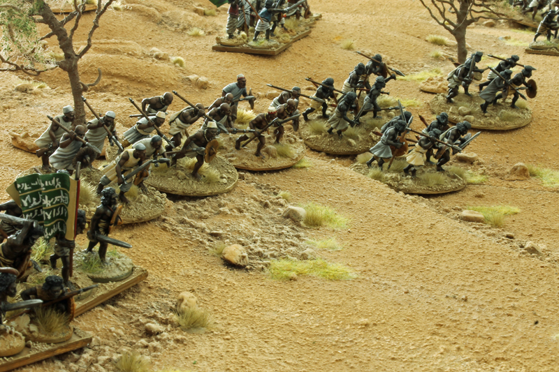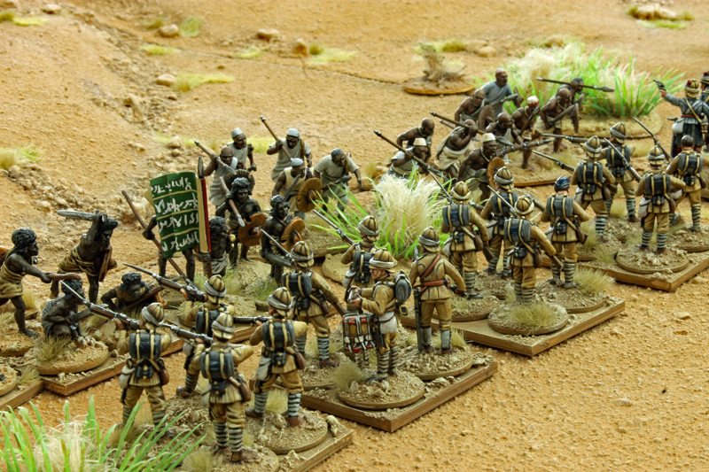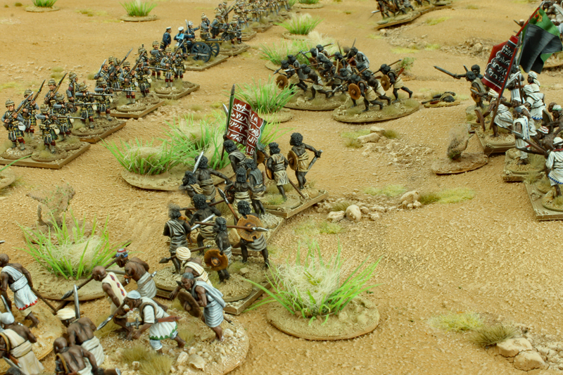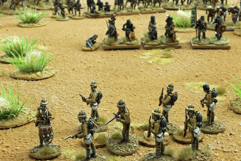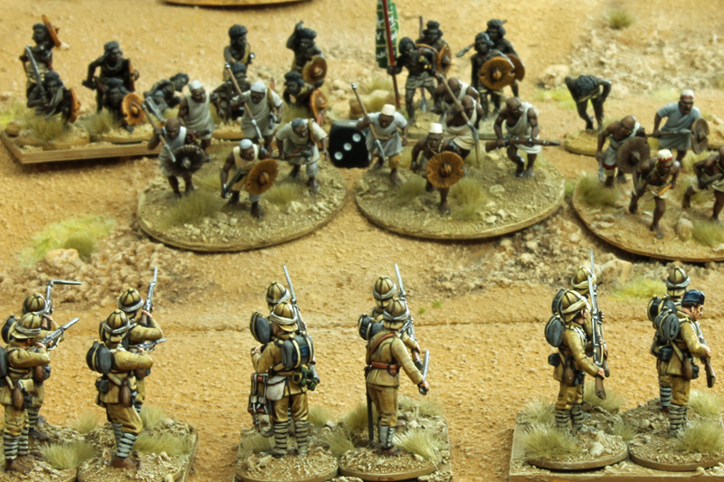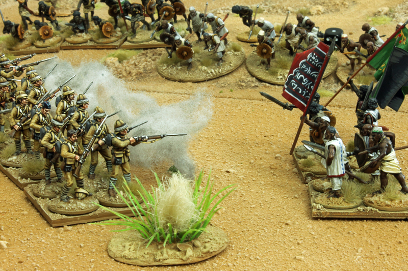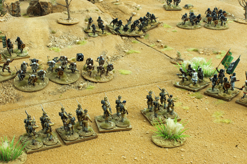 Zwei der Marker können die Beja wieder „sammeln“, ihre Streitmacht ist also nur leicht angeschlagen und schon teilweise in Angriffsreichweite. Aber in dieser Runde schafft keine der Beja-Einheiten in den Nahkampf zu kommen. Die Angreifer sind jedoch nun in effektiver Reichweite der Gewehre und der Gatling, wodurch sofort eine Einheit zum Stehen gebracht und eine zweite auf eine Base reduziert wird. Zusätzlich können 4 weitere Disorder – Marker verursacht werden. Jetzt wird es spannend…