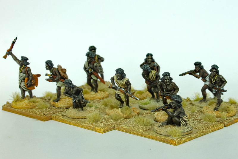 Bei den Figuren handelt es sich ausnahmslos um Perry Miniaturen, und zwar zur Hälfte aus den Plastik- und zur Hälfte aus Zinnfiguren. Eine Einheit hat runde Mulitbasen, der Rest besteht aus Einzelfiguren, die, wie bei den Briten, auf quadratische 4er-Maganetbasen gestellt werden. Die Kamelreiter sind allerdings alle einzeln basiert und werden auch bei größeren Spielen einzeln bewegt. Da es sich aber nur um eine kleine Einheit handelt, sollte das kein Problem darstellen.