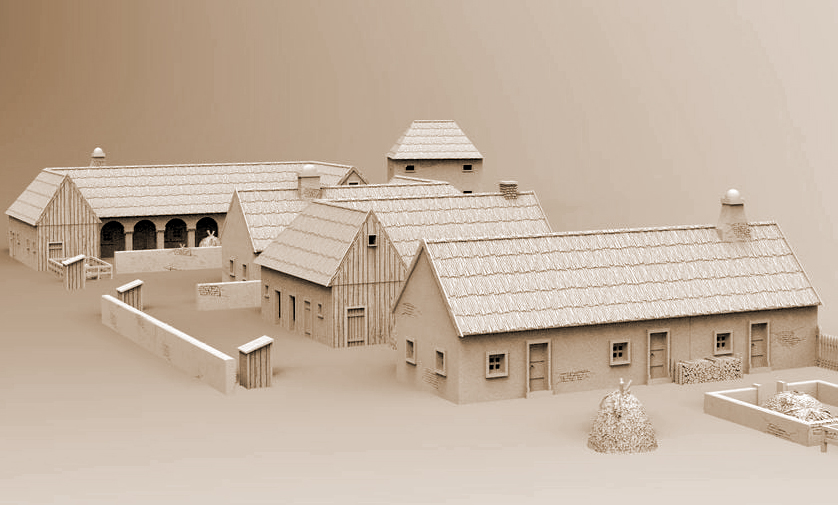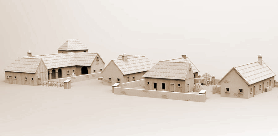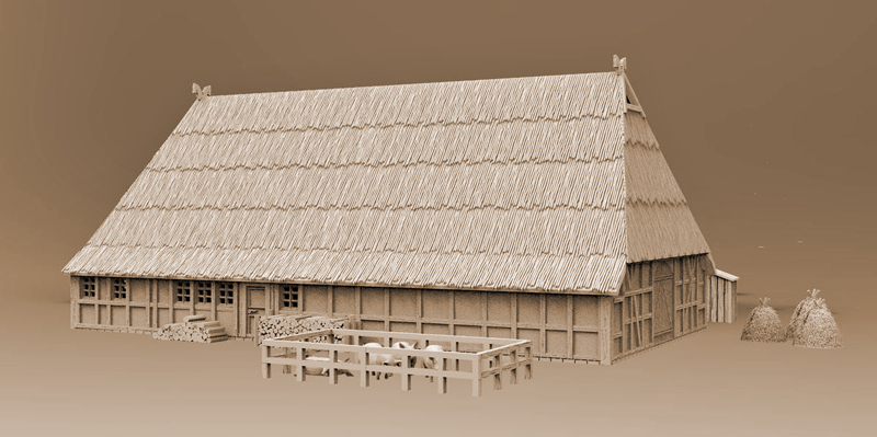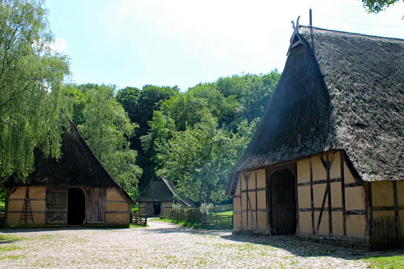 Neben dem Hallenhaus gibt es aber auch kleinere Katen und Varianten, bei denen die lehmverputzen Gefache mit Steinen ausgefüllt sind. Zäune, Heuhocken und Hof-Tiere runden das Ganze ab.