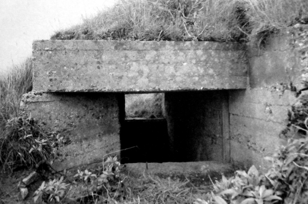 (5) Auf der Vorderseite, also Richtung Meer, befand sich eine B-Stelle mit einer ungewöhnlichem Doppel-Scharte, die auch als MG-34-Stellung diente. Es handelte sich nicht um einen Regelbau (RB), sondern eine Sonderkonstruktion (SK). Die B-Stelle verfügte über einen kleinen Eingangsraum, einen Unterstand sowie einen Gang, der zu einem Kampfraum führte, der über zwei seitliche Scharten verfügte. Von diesem Bunker wurde die 3. Batterie II. / 352 Artillerie Regiment gelenkt. Durch Scharten konnte außerdem der Strand in Richtung Osten und Westen unter Beschuss genommen werden. Aufgrund der hohen Vegetation bei meinem letzten Besuch, war der Bunker kaum zu entdecken.