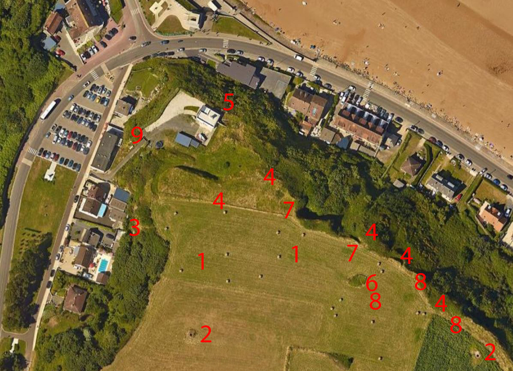 (4) Neben den beiden MG-Tobruks und den beiden Doppel-MG-Ständen gab es fünf weitere MG-Positionen in offenen Stellungen, wohl teilweise mit Wellbach-Überdachung, die am Rand der Klippen mit Blick auf den Strand eingerichtet worden waren.