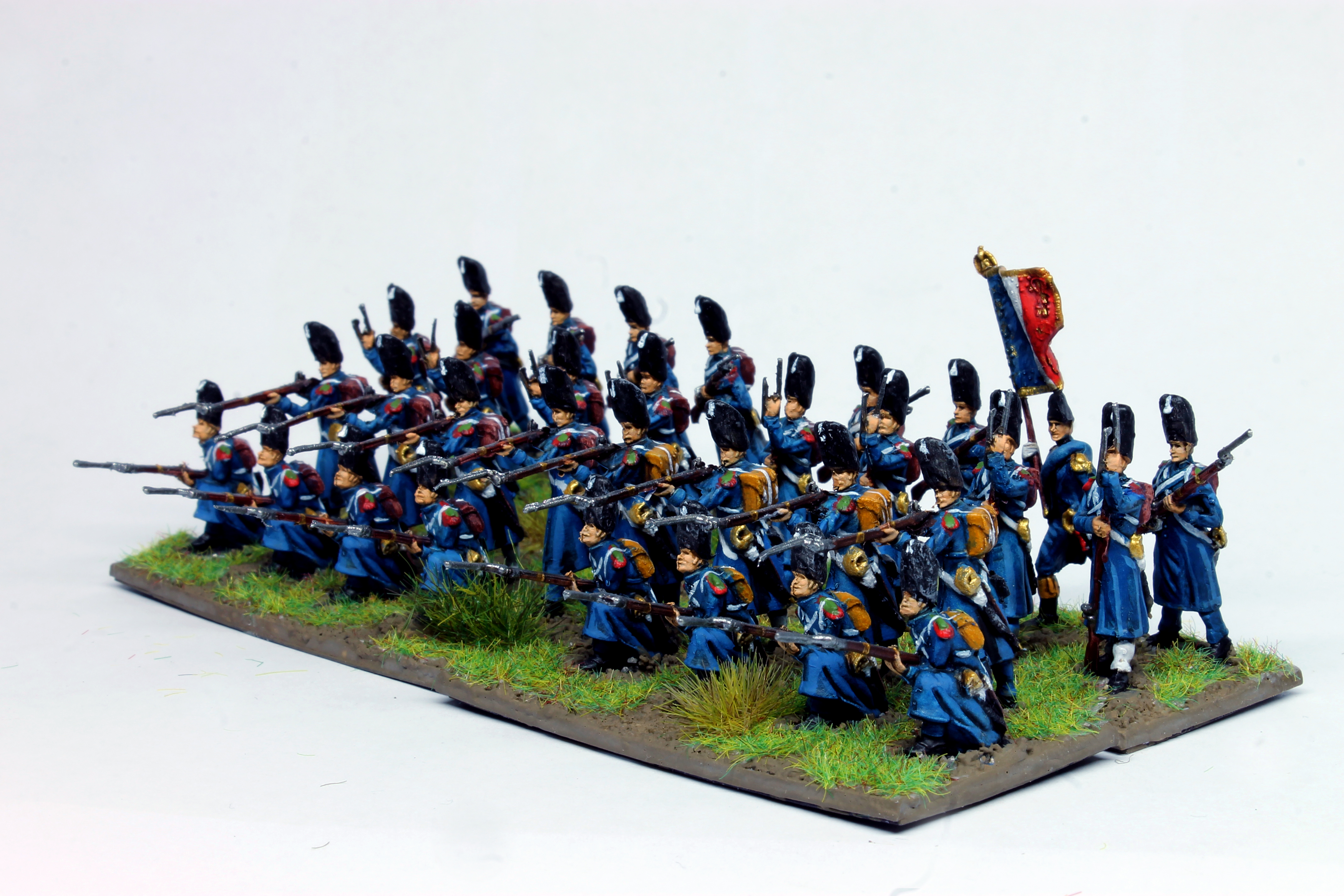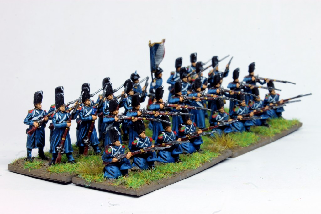 Vasa hat nun schon drei Einheiten der Garde Chasseurs zu Fuß fertig bemalt. Bei den Figuren handelt es sich eigentlich um die Garde Grenadiere von Revell, aber da man nur das Blech der Bärenfellmütze übermalen musste, finde wir die Figurenwahl völlig in Ordnung. Die vierte Einheit und einige zusätzliche Plänkler sind in Arbeit. Hierfür werden aber dann Zinnfiguren von Art Miniaturen und ein paar alte Kennigton verwendet.