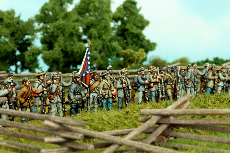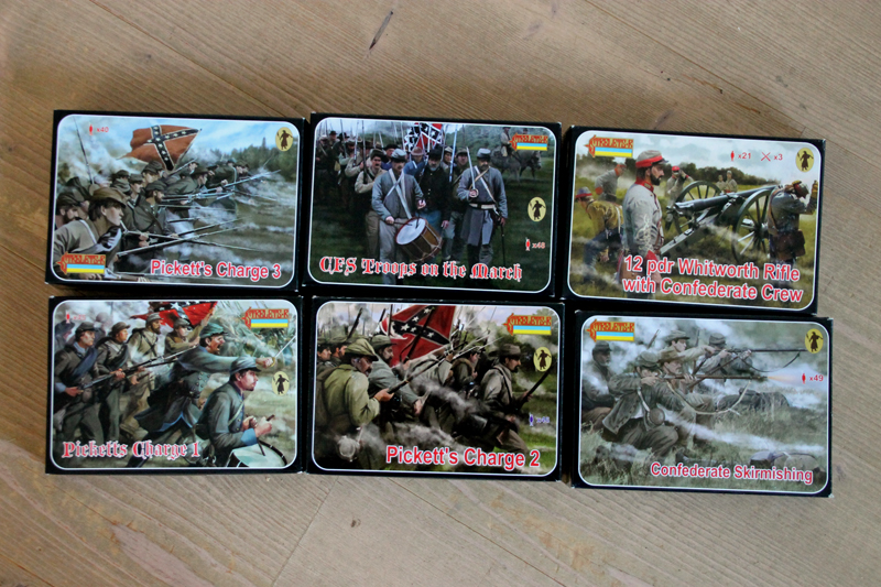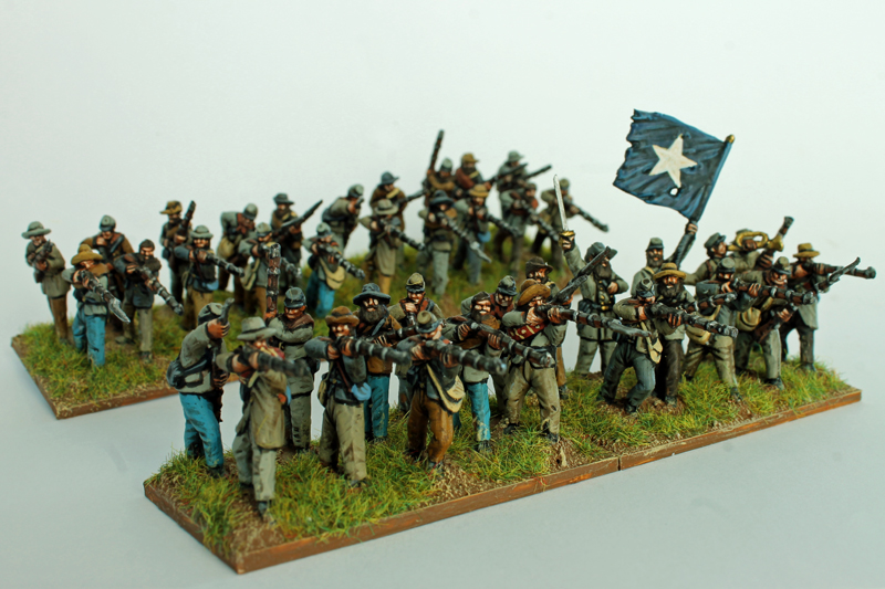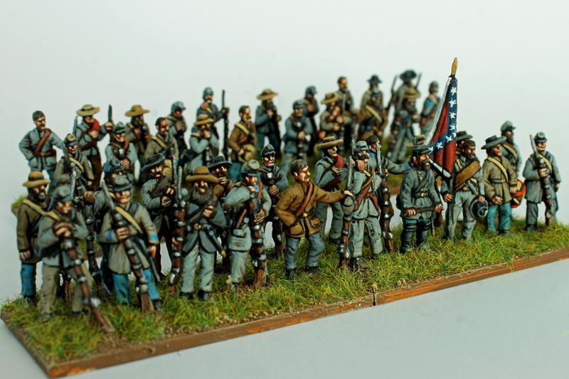 Die erste Einheit Infanterie besteht komplett das der Strelets-Box „Confederate Infantry Standing“. Erst hatte ich wenig bedenken, was die Qualität der Modellierung angeht, aber die Figuren sind besser als gedacht und ließen sich gut bemalen.